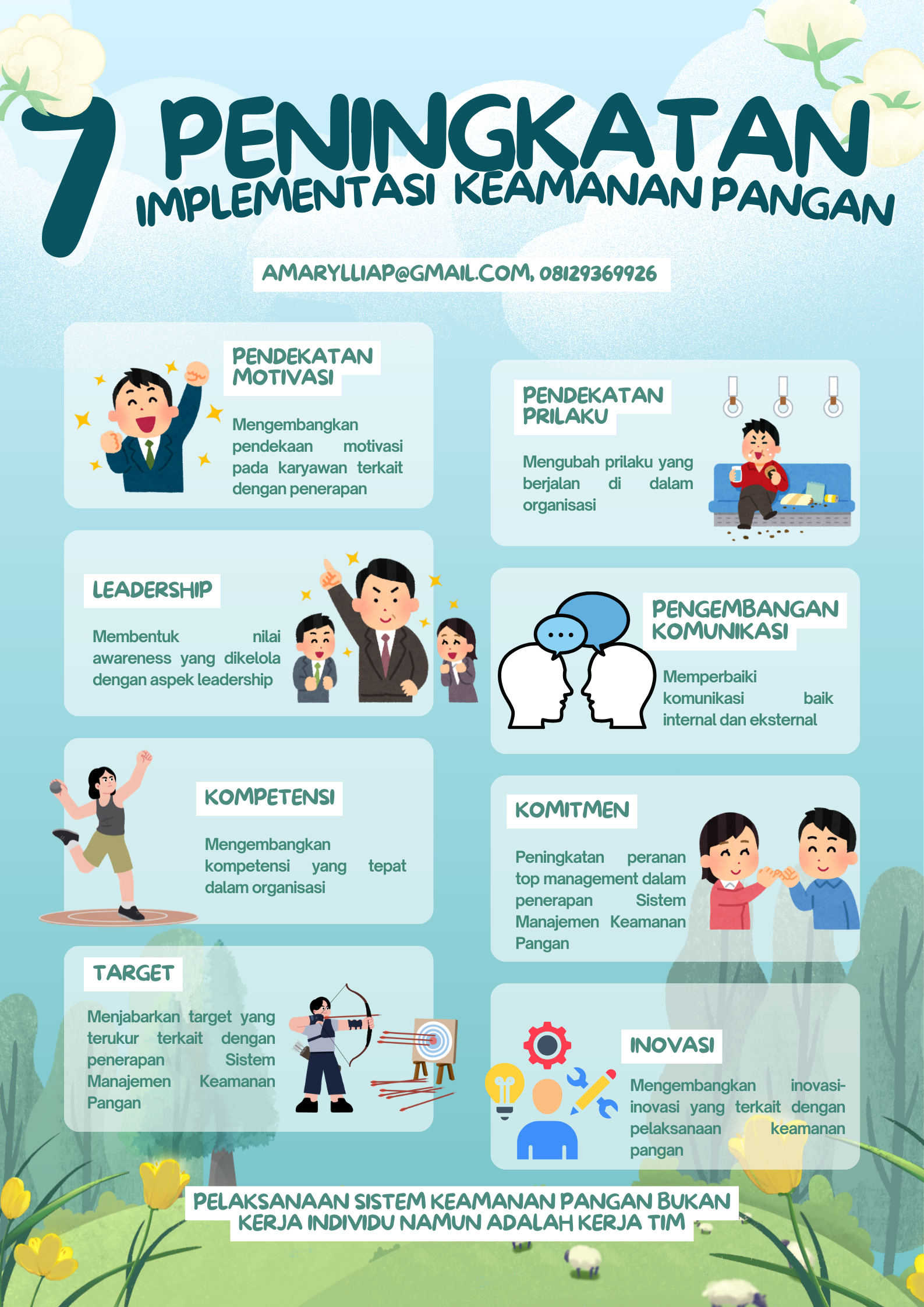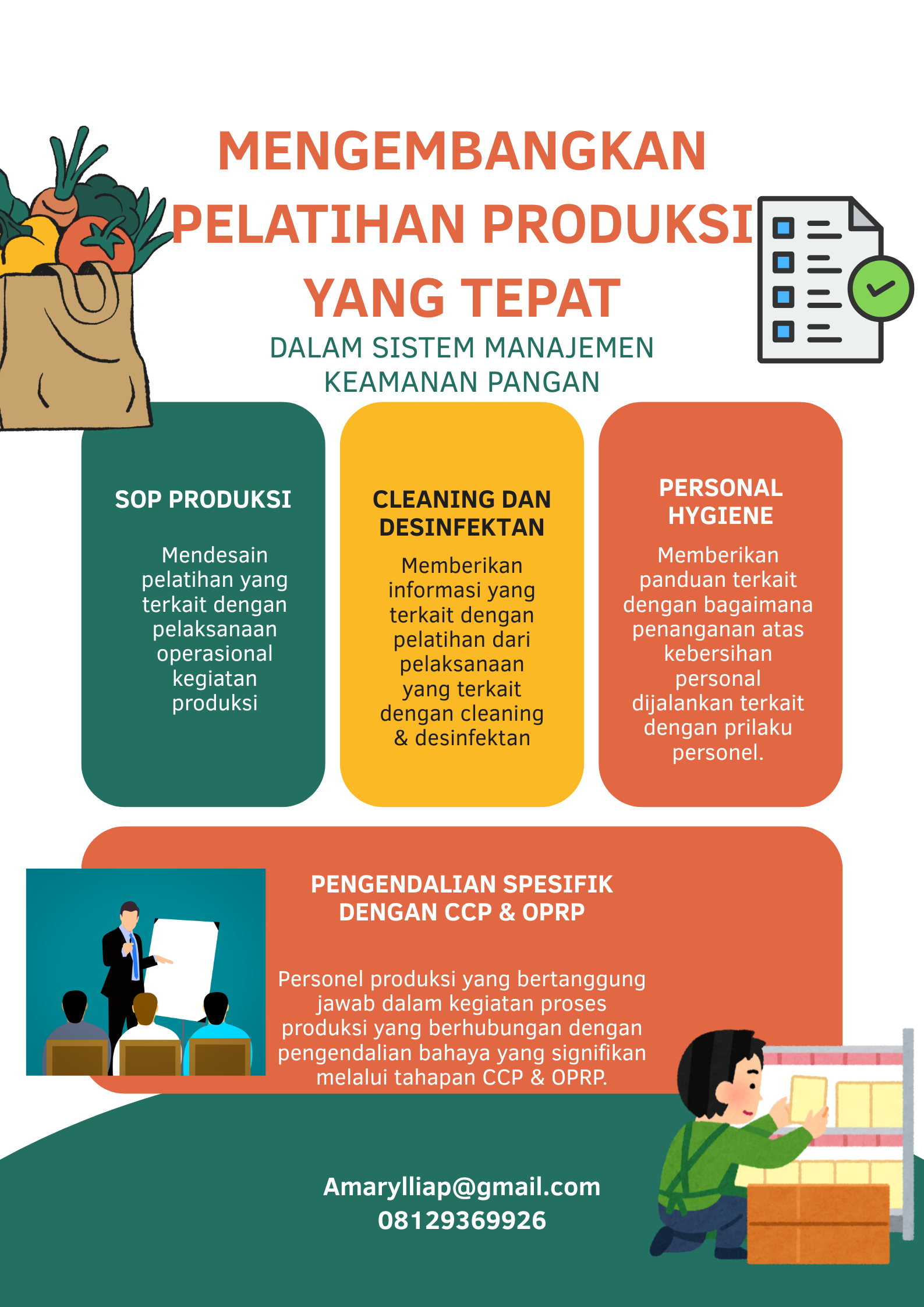 Desain pelatihan yang tepat dapat mewujudkan keamanan pangan yang memberikan hasil terbaik. Untuk mendesain pelatihan, lakukan proses penyusunan kurikulum dengan tujuan dari target proses pembelajaran tersebut. Lakukan proses pencarian referensi eksternal yang tepat untuk mengembangkan sistem pelatihan keamanan pangan di dalam perusahaan. (amarylliap@gmail.com, 08129369926)