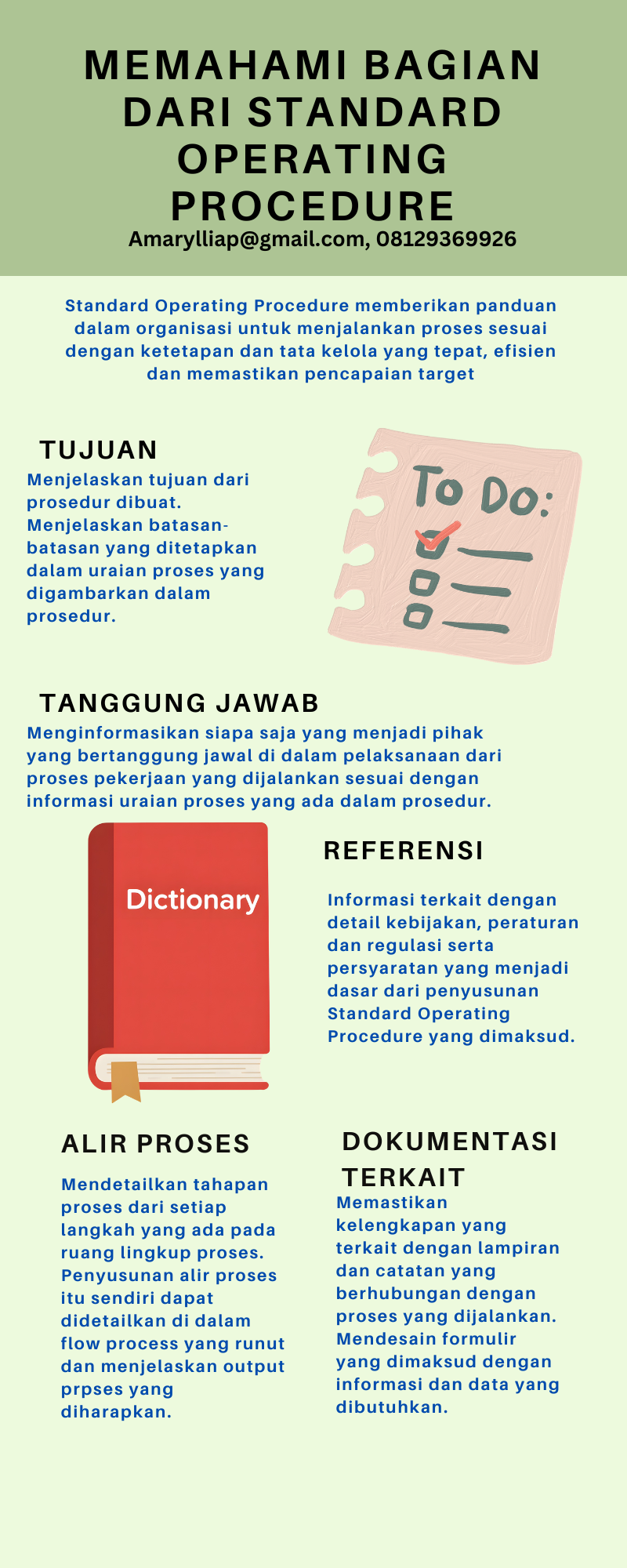 SOP yang tepat dapat memberikan panduan dan penjelasan proses di dalam organisasi dengant tepat. Penyusunannya sendiri dilakukan dengan evaluasi atas proses serta pengendalian atas proses untuk meminimalkan resiko dan output produktifitas yang tepat. Lakukan proses pencarian referensi eksternal yang tepat untuk dapat memaksimalkan Standard Operating Procedure yang tepat di dalam perusahaan. (amarylliap@gmail.com, 08129369926)
