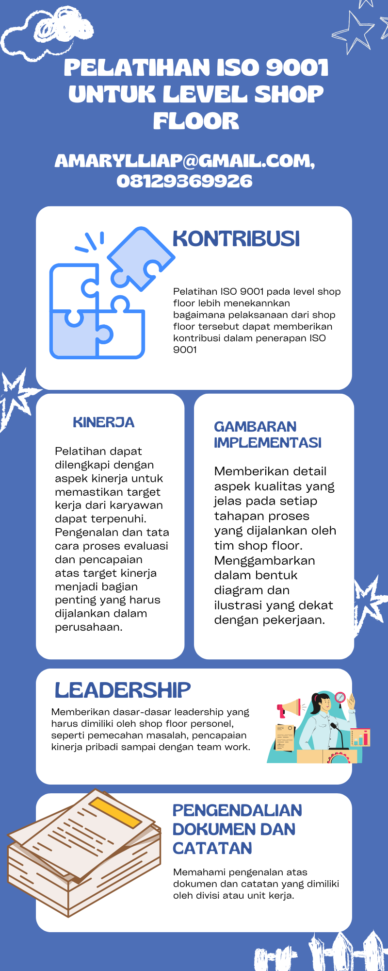 Pelatihan ISO 9001 baik itu pemahaman ataupun awareness terkadang disajikan dalam bentuk program pelatihan yang rumit dengan bahasa manajemen yang kadangkala menjadi sulit dipahami secara praktis. Untuk dapat mengimplementasikan dengan tepat, berikut ini adalah bentuk yang dapat dikembangkan untuk pelatihan pada level shop floor.