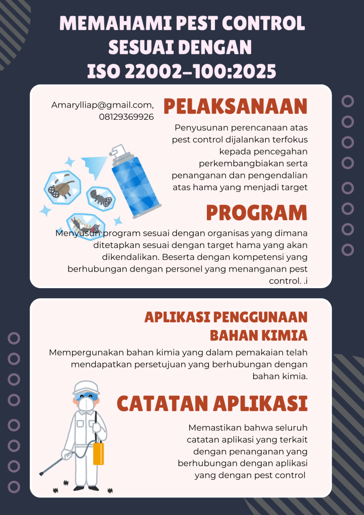 Melakukan penanganan pest control menjadi salah satu bagian penting dalam penerapan Sistem Manajemen Keamanan Pangan. Berdasarkan pada penerapan ISO 22002-100:2025 sesuai dengan PRP (Pre Requisite Program), berikut ini adalah pengendalian Pest Control yang diterapkan sesuai dengan ketentuan yang telah ditetapkan.
