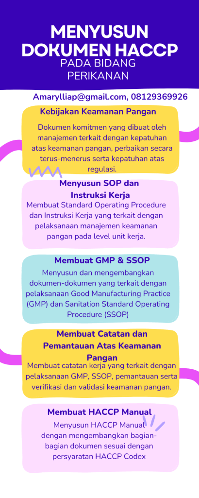 Perusahaan dalam melakukan penyusunan dokumen ada baiknya menjalankan proses validasi yang tepat. Penggunaan referensi, panduan serta template yang tepat dapat dipergunakan untuk menyusun dokumen HACCP. Lakukan proses pencarian referensi eksternal yang tepat untuk menyusun HACCP Manual. (amarylliap@gmail.com, 08129369926)