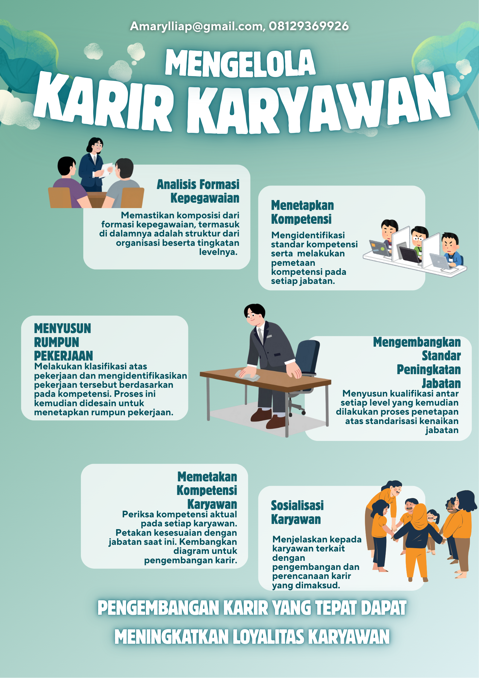 Karir yang terkelola dengan tepat dapat meningkatkan rasa memiliki dalam perusahaan. Dimana karyawan merasa adanya perlakuan yang tepat dalam menjalankan aspirasi dari mereka dan bagaimana mereka dapat berkembang sesuai dengan kebutuhan organisasinya. Pengembangan talent internal bukanlah hal yang mudah namun patut untuk diperjuangkan sebagai bentuk penghargaan perusahaan kepada karyawannya. (amarylliap@gmail.com, 08129369926)