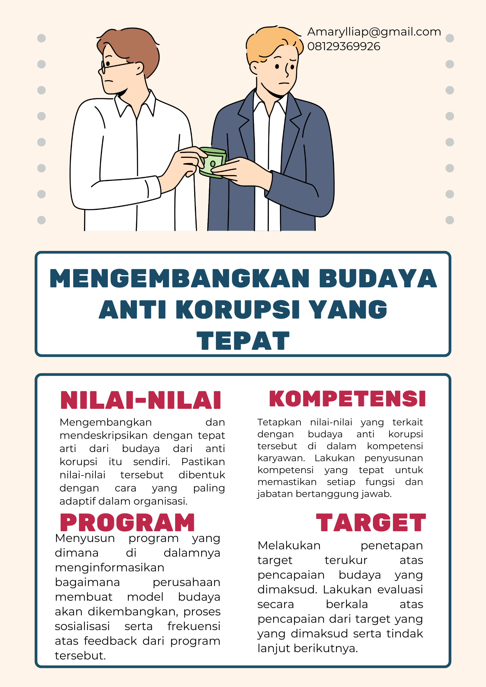 Untuk mendapatkan pendekatan yang lebih mendetail atas pengembangan budaya anti korupsi tersebut, perusahaan dapat mempergunakan referensi eksternal yang berpengelaman dalam melakukan pengembnangan budaya perusahaan. Lakukan penyusunan program budaya dengan tepat untuk memaksimalkan implementasi budaya perusahaan di organisasi Anda. (amarylliap@gmail.com, 08129369926)