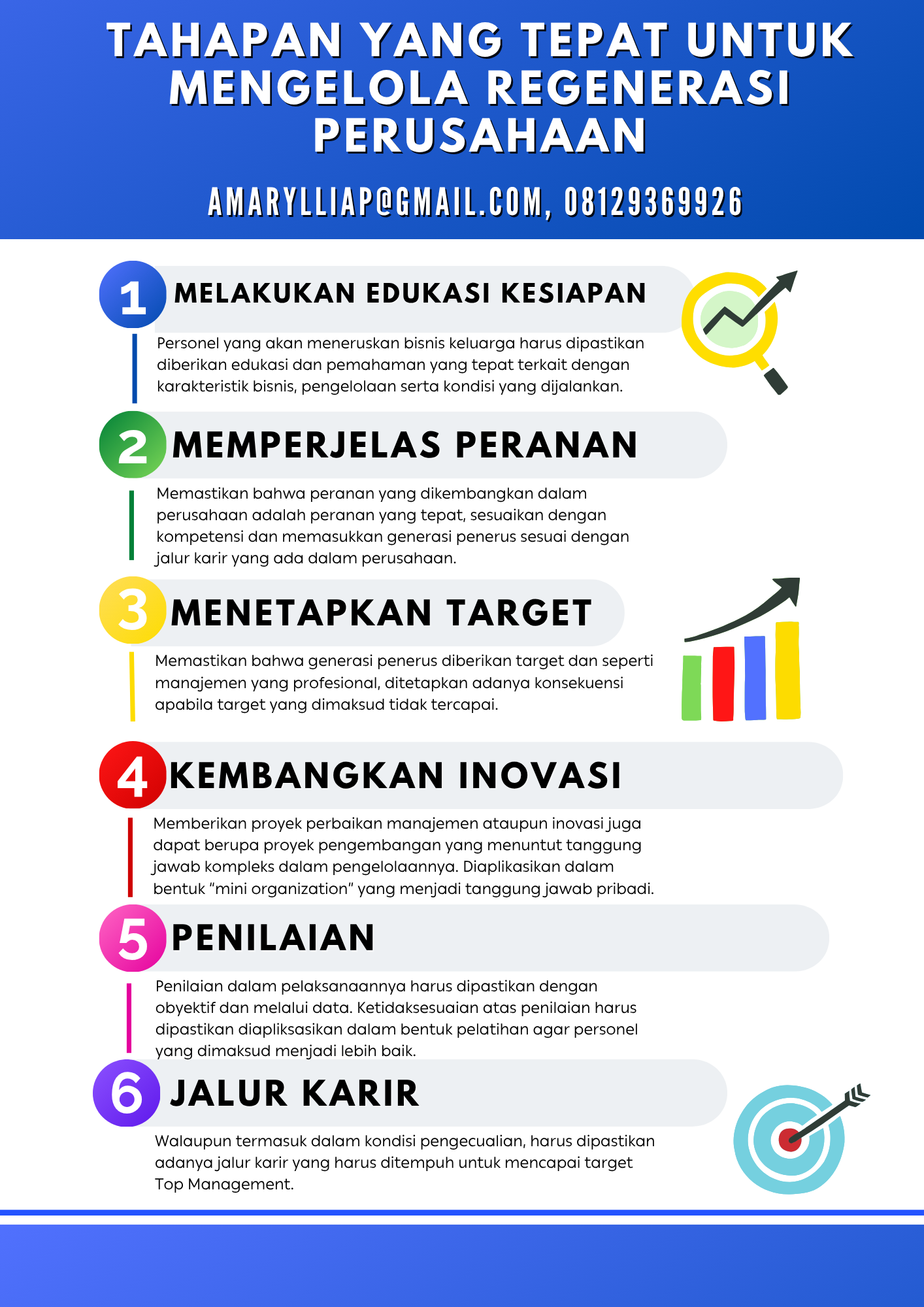 Dengan menjalankan tahapan yang dimaksud, diharapkan regenerasi dapat berjalan dengan baik. Profesionalisme dalam perusahaan tetap terjaga bahkan perusahaan dapat lebih berkembang lagi. Untuk dapat mengembangkan regenerasi perusahaan yang tepat, lakukan pencarian referensi eksternal yang tepat dan pengalaman dalam proses regenerasi perusahaan. (amarylliap@gmail.com, 08129369926)